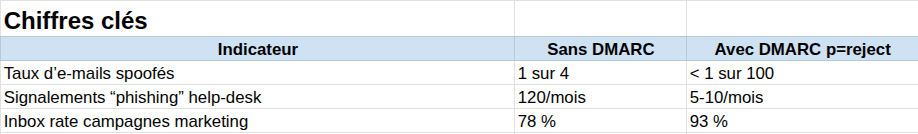 Résultat : conformité NIS2 validée; BIMI déployé → +9 % de clics sur newsletters.